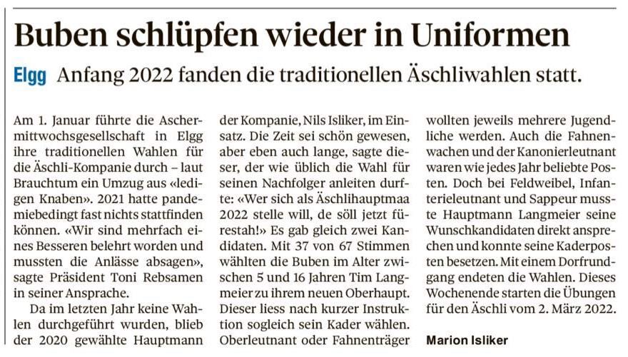 Hans Mäschli (Ehrenpräsident der Aschermittwochsgesellschaft) führt uns in das Brauchtum des Äschli in Elgg ein. Historie, Wahlen, Äschlikompanie, Tagesbefehl, Hauptmannrede, Soldverteilung, Züri-Elgger und Flaachtaler sind einige Stichworte.